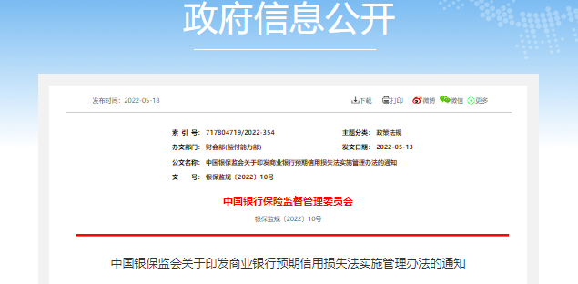 中國銀保監(jiān)會關于印發(fā)商業(yè)銀行預期信用損失法實施管理辦法的通知