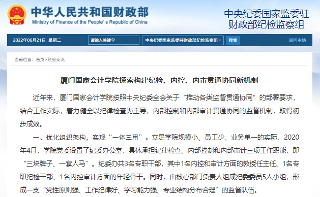 廈門國家會計(jì)學(xué)院探索構(gòu)建紀(jì)檢、內(nèi)控、內(nèi)審貫通協(xié)同新機(jī)制
