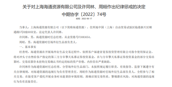 為此,中期協(xié)給予海通資源“公開譴責(zé)同時取消場外衍生品業(yè)務(wù)備案,6個月內(nèi)不再受理其場外衍生品業(yè)務(wù)備案申請”的紀(jì)律懲戒;對許同林、周晅雙雙給予“公開譴責(zé)”的紀(jì)律懲戒。