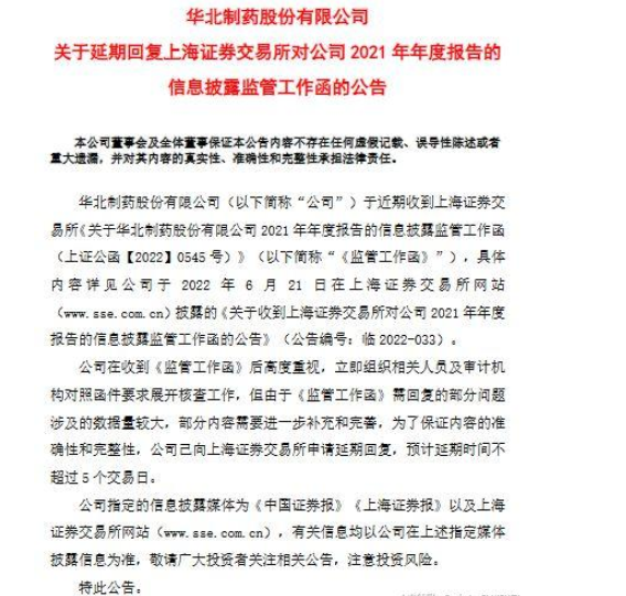 同時(shí),上交所要求華北制藥于5個(gè)交易日內(nèi)回復(fù)并對(duì)定期報(bào)告作相應(yīng)修訂和披露。華北制藥以“數(shù)據(jù)量較大、時(shí)間較為久遠(yuǎn)”為由,申請(qǐng)延期于6月27日前完成回復(fù)工作。不過,6月27日,華北制藥又再次延長(zhǎng)了5個(gè)交易日。