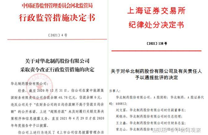 2021年5月31日,因華北制藥2020年度在財(cái)務(wù)公司的超限存款未及時(shí)履行關(guān)聯(lián)交易決策程序和信息披露義務(wù),華北制藥收到證監(jiān)會(huì)河北監(jiān)管局《關(guān)于對(duì)華北制藥股份有限公司采取責(zé)令改正行政監(jiān)管措施的決定》。事實(shí)上,華北制藥直至2021年4月29日才在2020年年度報(bào)告中進(jìn)行披露。