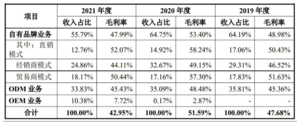 該公司業(yè)務(wù)模式分為自有品牌業(yè)務(wù)和OEM/ODM代工業(yè)務(wù),其中自有品牌業(yè)務(wù)因存在一定的品牌溢價(jià),盈利能力較強(qiáng),毛利率較ODM業(yè)務(wù)略高且遠(yuǎn)高于OEM業(yè)務(wù)。然而報(bào)告期內(nèi),該公司自有品牌SEAFLO帶來(lái)的收入占公司營(yíng)業(yè)收入的比例由64.19%下降至55.79%,2021年近一半收入來(lái)自于OEM/ODM代工,從而導(dǎo)致整體毛利率水平下降。