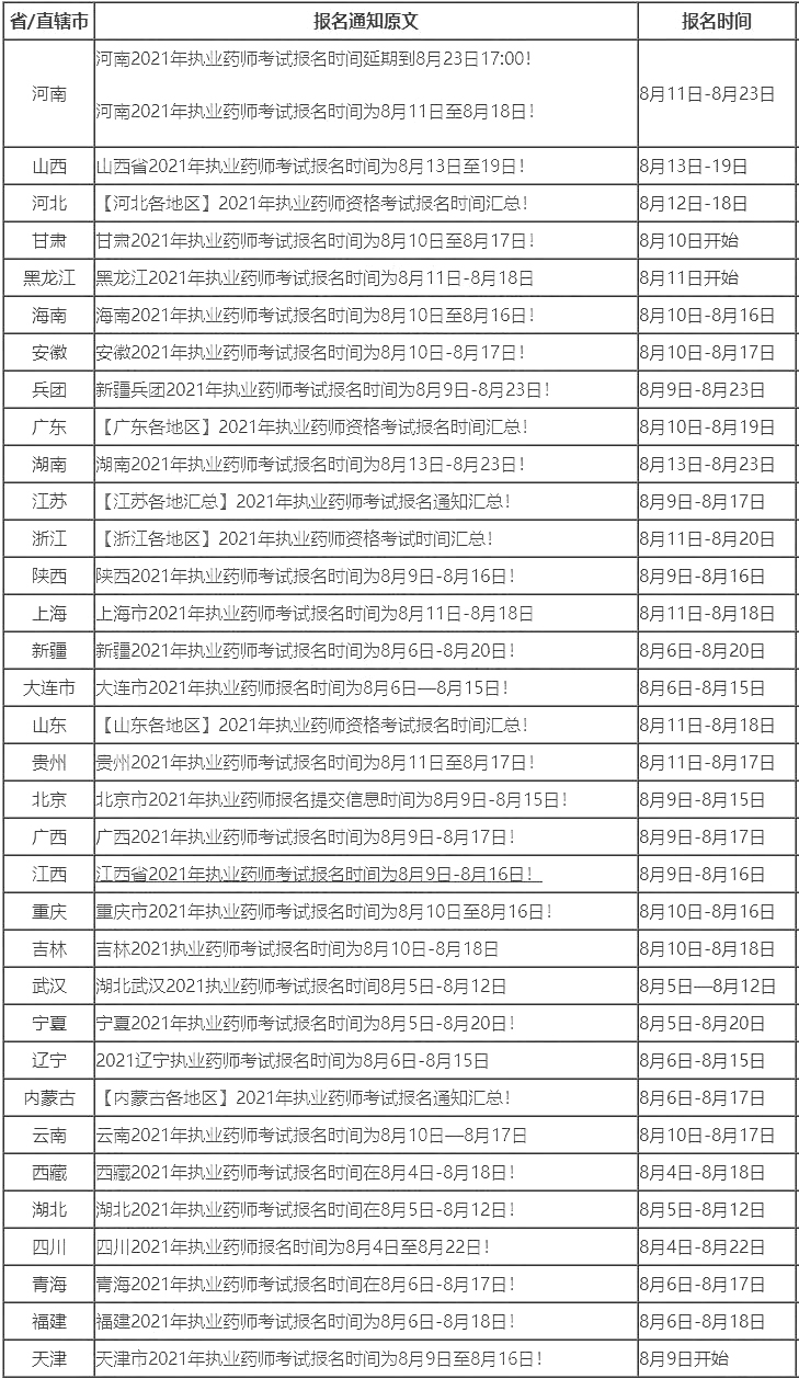 執(zhí)業(yè)藥師的報名時間一般都是在每年的7、8月份,2021年執(zhí)業(yè)藥師考試報名最早考試報名的省份是從8月4日開始的。今年的考試時間比去年要晚10天左右,所以預計今年的執(zhí)業(yè)藥師報名時間應該比去年的報名時間晚一些,8月中旬的可能性較大。因每年執(zhí)業(yè)藥師考試報名時間都會有所差異,各地執(zhí)業(yè)藥師報名通知時間要依據當地人事考試網發(fā)布的信息為準。
