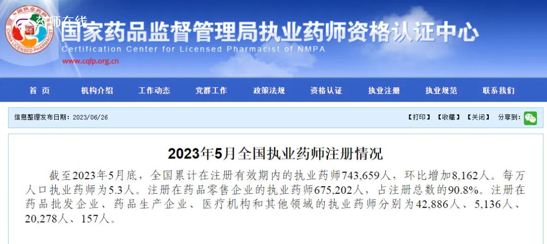 近日,國(guó)家藥品監(jiān)督管理局執(zhí)業(yè)藥師資格認(rèn)證中心發(fā)布了2023年5月執(zhí)業(yè)藥師注冊(cè)情況。