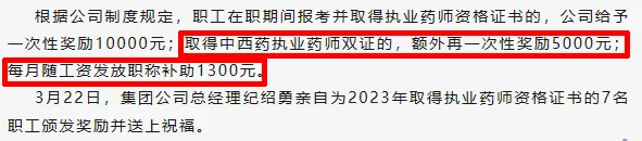 取得中西藥執(zhí)業(yè)藥師雙證的,額外再一次性獎(jiǎng)勵(lì)5000元;每月隨工資發(fā)放職稱補(bǔ)助1300元。