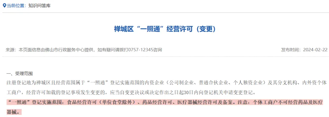 2024年佛山禪城《“一照通”經(jīng)營(yíng)許可(變更)》文件再次明確: