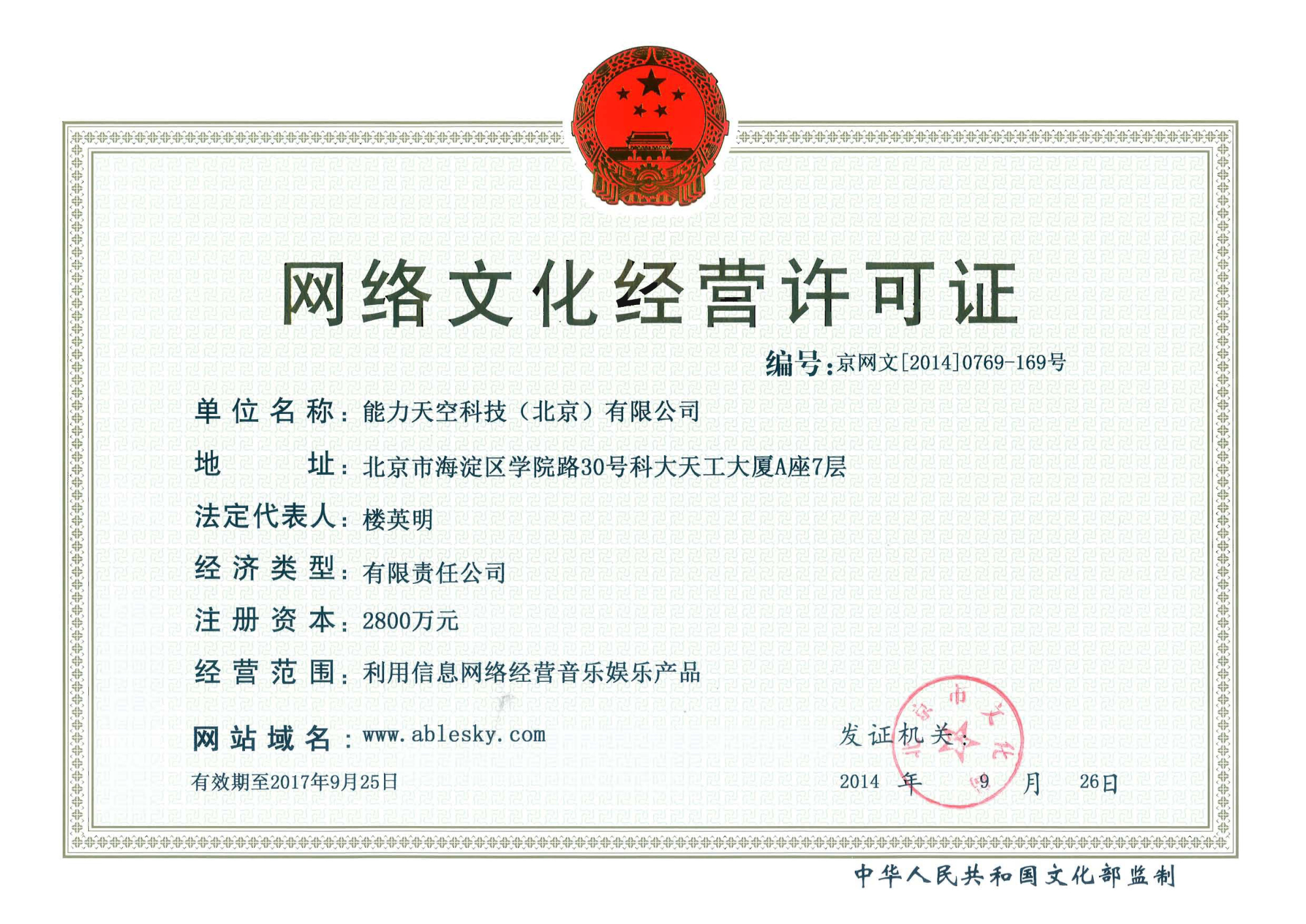 能力天空網(wǎng)絡(luò)文化經(jīng)營許可證