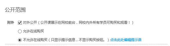1 發(fā)布課程:在點(diǎn)播課程“發(fā)布管理--基本信息頁面”,針對(duì)付費(fèi)的課程可以設(shè)置“不允許在線購買”,同時(shí)編輯提示語,提示學(xué)員在不允許購買的情況下該如何操作。