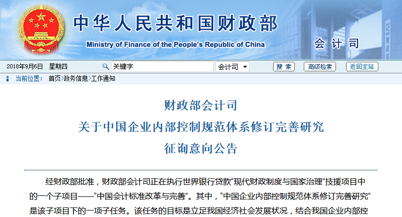 財(cái)政部會(huì)計(jì)司關(guān)于中國(guó)企業(yè)內(nèi)部控制規(guī)范體系修訂完善研究征詢意向公告