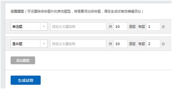 第二步:填寫試卷名稱,選擇目標(biāo)試卷類目,設(shè)置目標(biāo)試卷的題型、數(shù)量和相應(yīng)分值,