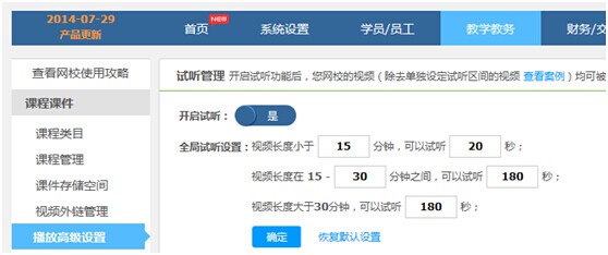 在網(wǎng)校后臺(tái)“教務(wù)教學(xué)”頻道下的“播放高級(jí)設(shè)置”中,設(shè)置您的網(wǎng)校是否需要開啟試聽功能,選擇“否”代表您網(wǎng)校所有的課程不能被試聽;當(dāng)您開啟試聽時(shí),您可以在此設(shè)置您網(wǎng)校所有課件的全局試聽時(shí)長;