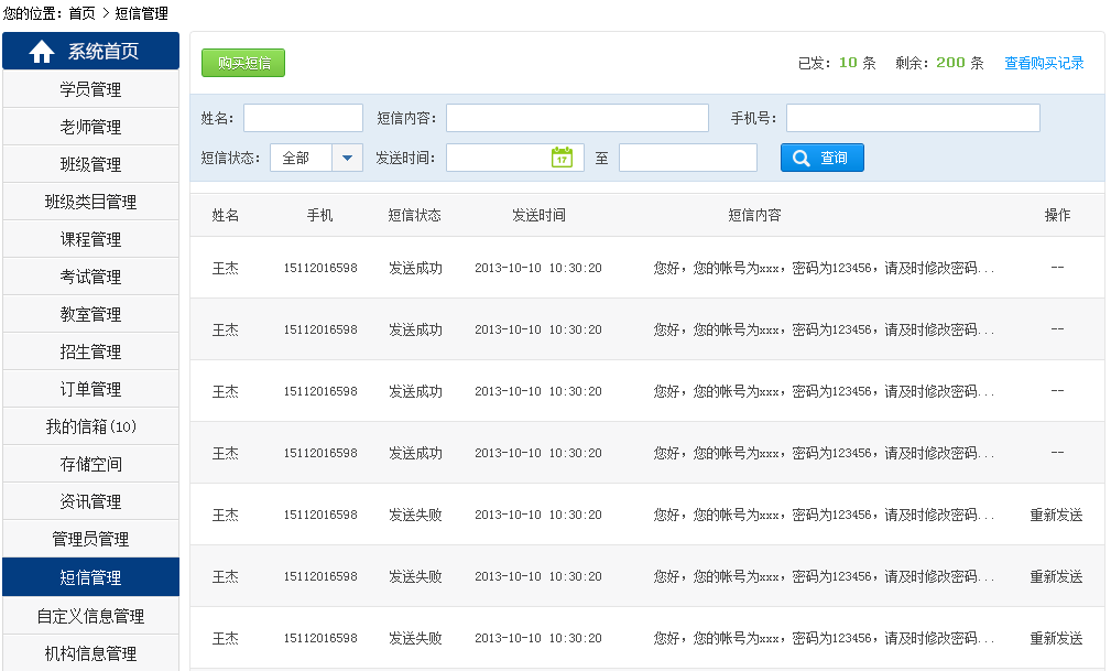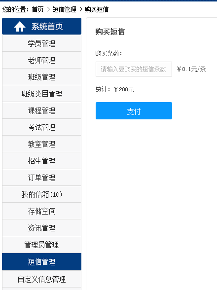 1 管理員可以查看短信的發(fā)送記錄,并且可以線上購買短信條數(shù)啦。