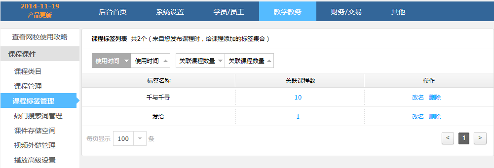 在管理后臺(tái)\教學(xué)教務(wù)\課程課件中,增加了“課程標(biāo)簽管理”功能。您可以對(duì)課程詳情頁所展示的標(biāo)簽進(jìn)行管理了!