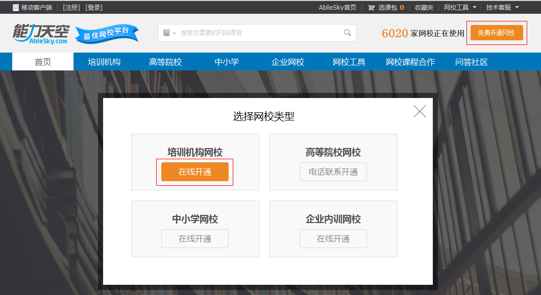 1. 請(qǐng)先點(diǎn)擊“免費(fèi)開通網(wǎng)校”,選擇要開通的網(wǎng)校類型