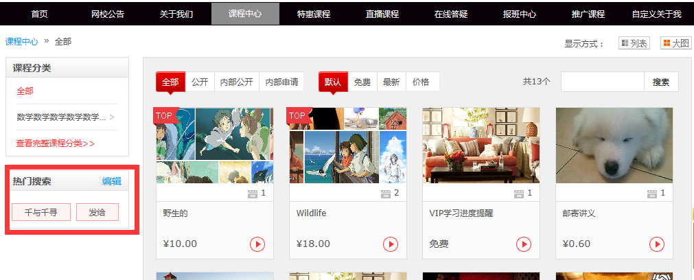 在管理后臺(tái)\教學(xué)教務(wù)\課程課件中,增加了“熱門搜索詞管理”功能。在這里您可以對(duì)課程中心展示的熱門搜索關(guān)鍵詞進(jìn)行編輯。以便引導(dǎo)學(xué)員搜索相關(guān)內(nèi)容。